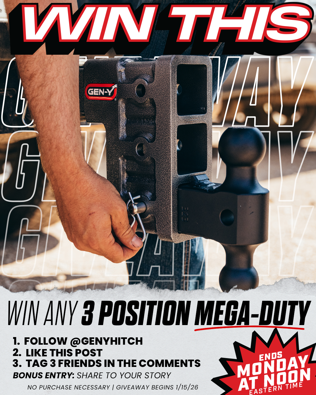 I. SWEEPSTAKES PERIOD: The “3 Position MEGA-DUTY” Sweepstakes (herein referred to as the “Sweepstakes”) begins on or about 9:00:00 a.m. Eastern Time (“EST”) on January 15, 2026 ("Start Date") and ends at 11:59:59 a.m. EST on January 19, 2026 (the “Promotion Period”). The Sweepstakes is sponsored by GEN-Y Hitch, 3400 W. Market St., Nappanee, Indiana 46550 (the “Sponsor” and “Prize Supplier”). The official clock for purposes of the Sweepstakes is the computer of the Sponsor.